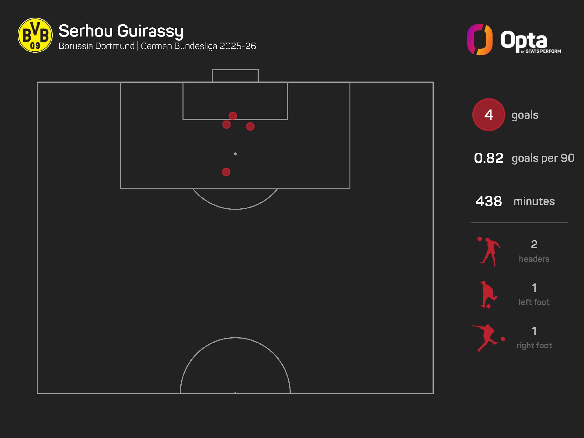 Since signing for Dortmund in July 2024, only Kane (59), Kylian Mbappe (58), Erling Haaland (46) and Lewandowski (46) have scored more than Guirassy's 44 across Europe's top five leagues in all competitions.