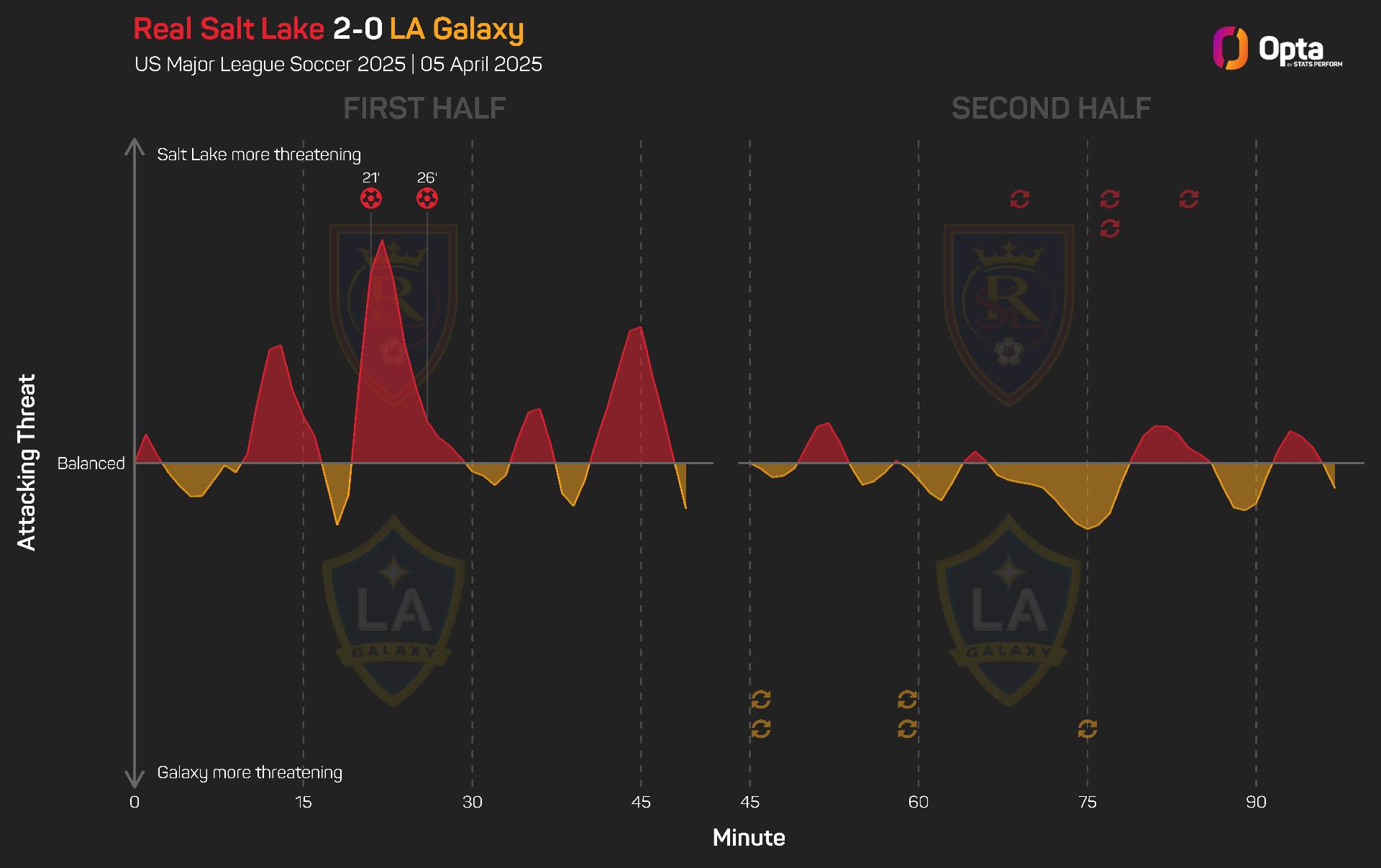 The Galaxy were unbeaten in five matches against RSL prior to Saturday's game but offered little threat as they failed to get any of their seven shots, worth 0.31 expected goals (xG), on target.
