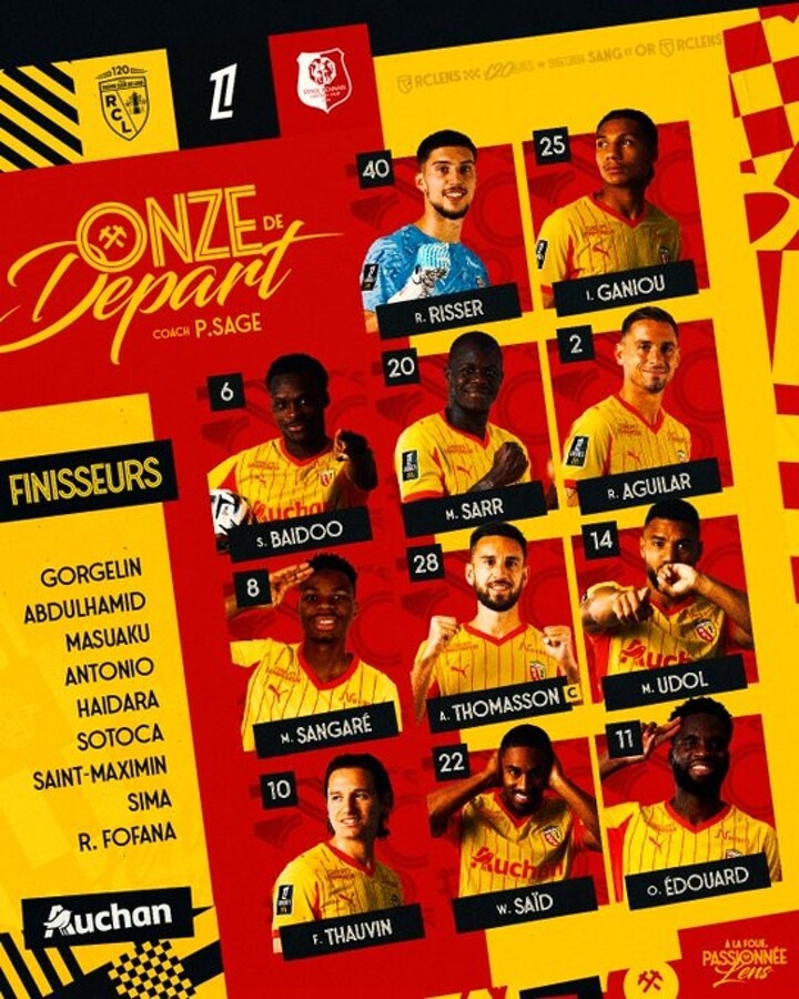 Lens XI: Thauvin, Aguilar, Said, Thomasson, Udol, Odsonne Édouard, Sarr, Samson Baidoo, Mamadou Sangaré, Robin Risser, Pierre Ganiou