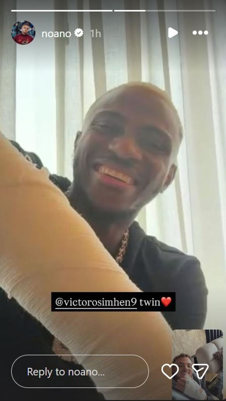 The two stricken team-mates shared a Facetime call on Thursday and appear to have taken comfort at finding themselves in a similar situation to each other. Posting a screenshot of them both grinning and holding up their casts, Lang wrote "twin" with a heart emoji while tagging Osimhen.