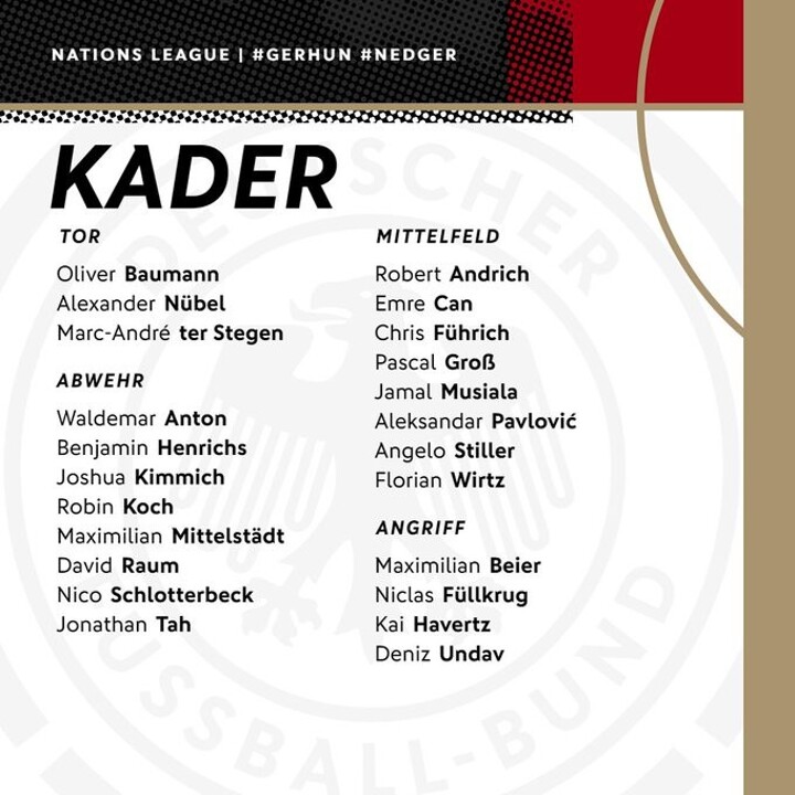 The latest German squad list for the Nations League matches against Hungary and the Netherlands: Havertz & Ter Stegen lead, Gnabry absent