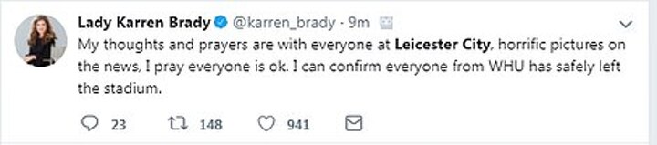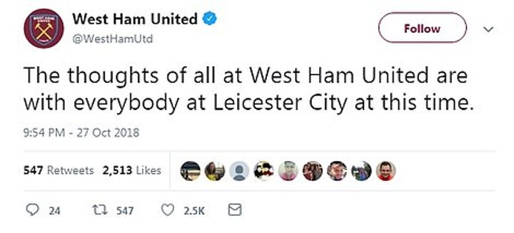 West Ham defender Pablo Zabaleta, who played in the game, tweeted: 'My thoughts and prayers are with all those involved in the helicopter accident at Leicester City.'