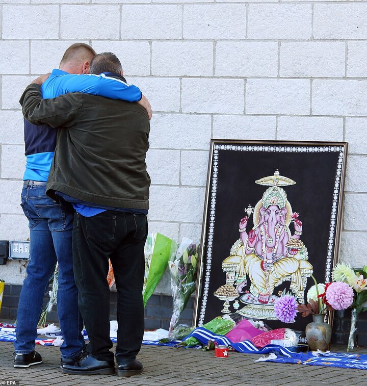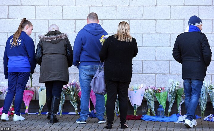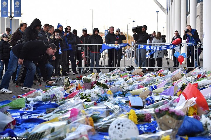 Tearful Leicester City fans gathered to lay flowers at the King Power Stadium today after the owner's helicopter came crashing down to earth and burst into flames shortly after taking off from the ground last night.
