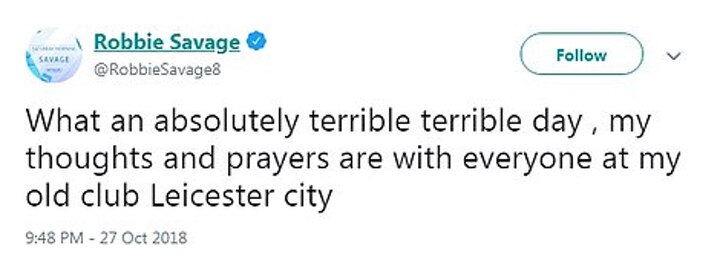 Former Foxes midfielder turned pundit Robbie Savage said: 'What an absolutely terrible terrible day , my thoughts and prayers are with everyone at my old club Leicester city.'