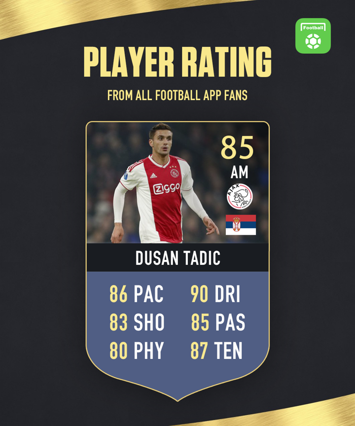 Hello everyone, welcome to - Daily Player Rating! You could be the judge and rate one player every day at 10:30 CET. The results will be declared in the form of Fut Card tomorrow. We released the rating of Dusan Tadic yesterday. The man who destroyed Madrid got 85 total points with highest 90 in dribbling. The detailed results are as follows: