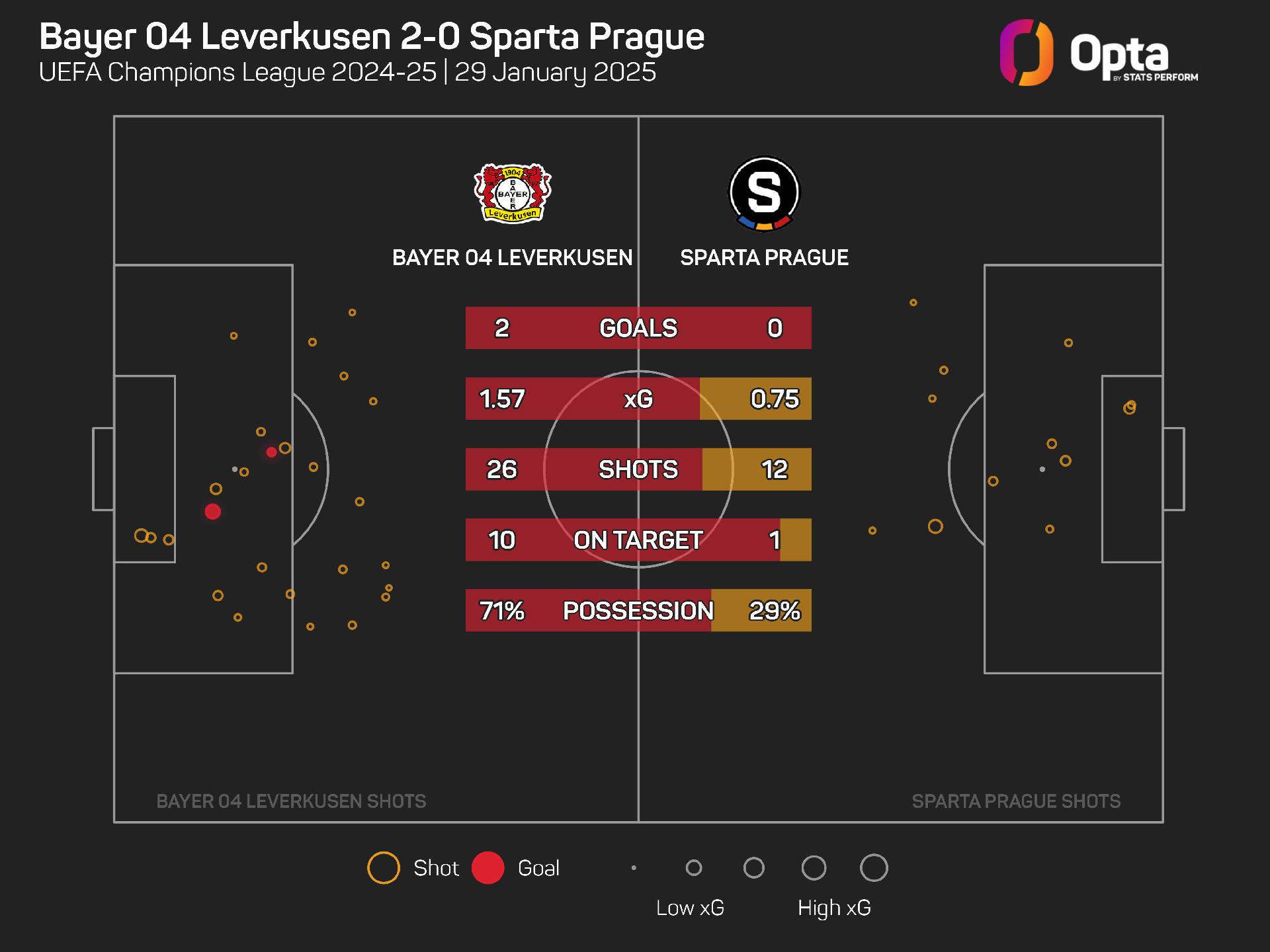And Leverkusen were worthy of their victory. They attempted 26 shots against Sparta, while only once on record (since 2003-04) have they had more in a Champions League match (29 v RB Salzburg in November 2024).