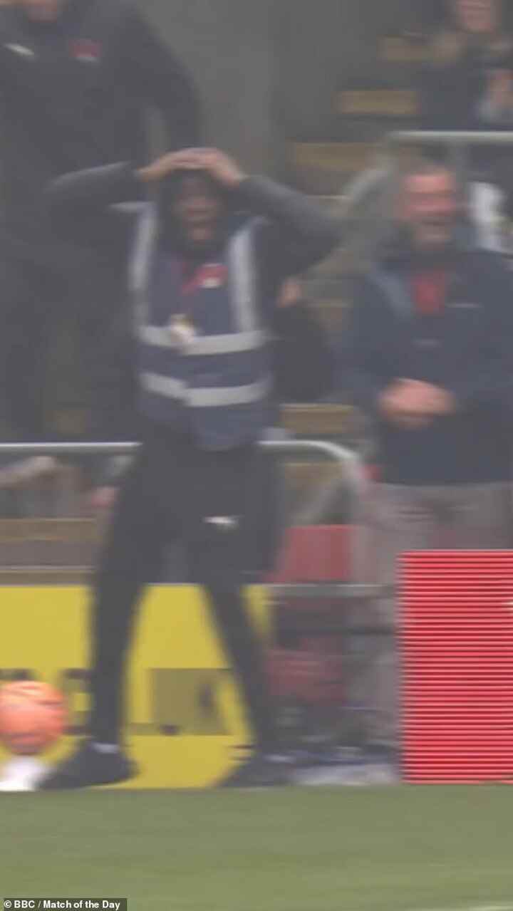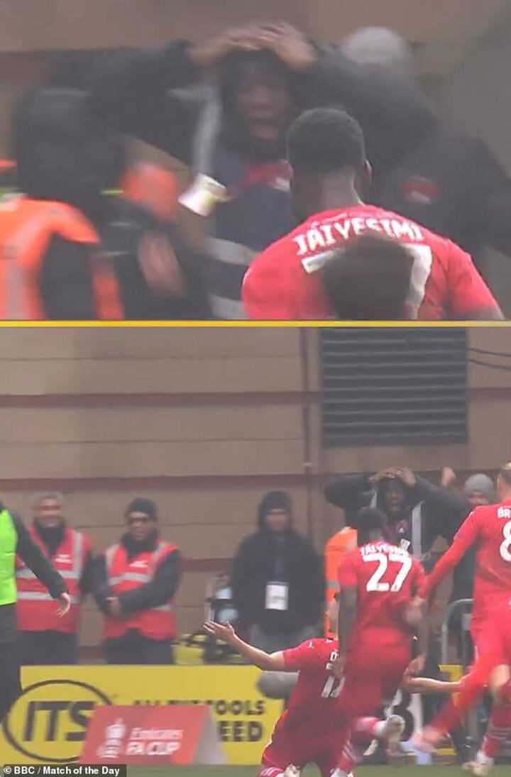 He can be seen holding his hands on his head, open-mouthed in celebration of forward Jamie Donley's strike, which bounced in off of Citizens goalkeeper Stefan Ortega to give the hosts a shock lead.