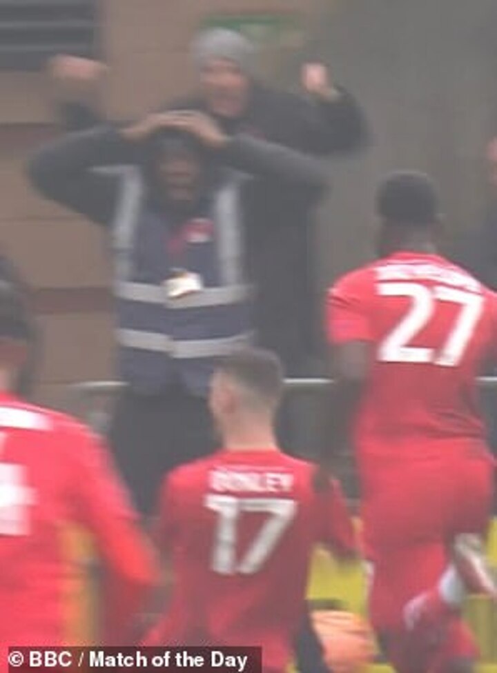 This is the moment that a steward reacted in joy and disbelief to Leyton Orient scoring an incredible goal from near the halfway line to take the lead in their FA Cup tie at home to Manchester City on Saturday afternoon.