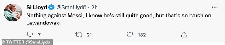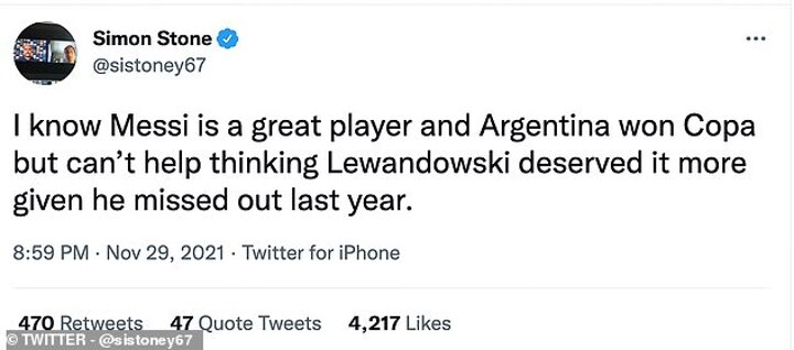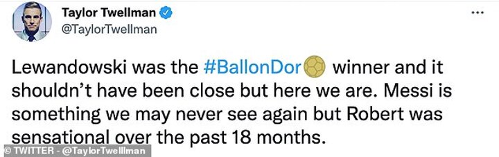 In a separate tweet, the former England international added: 'Messi agrees. Messi’s right. Give Robert Lewandowski the award. Such an easy thing to do, and the right thing to do.'