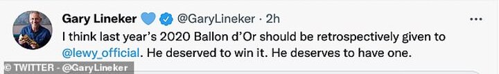 'I think last year’s 2020 Ballon d’Or should be retrospectively given to Robert Lewandowski,' the Match of The Day host tweeted.