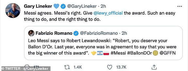 Gary Lineker shared Lionel Messi's belief that Robert Lewandowski should have been awarded the Ballon d'Or last year.