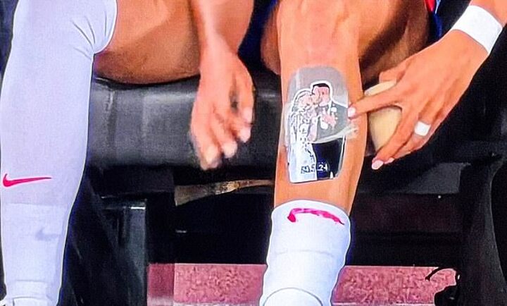 Tucked under her socks, Kelly wears shinpads printed with a photo of herself and her husband Scott Moore – a former Everton groundsman she met while playing there – on their wedding day alongside their dogs. A small personal reminder of home, even in the tensest of moments.