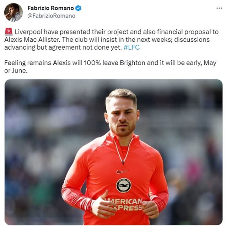 'Liverpool have presented their project and also financial proposal to Alexis Mac Allister,' writes Italian reporter Fabrizio Romano.
