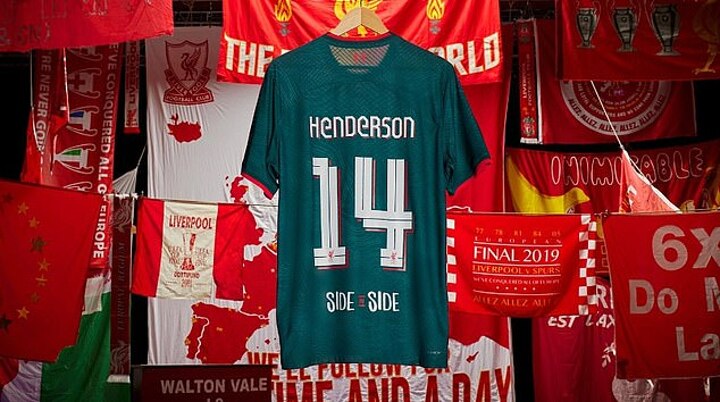 The style of Liverpool's street signs are reflected in the name and number patterns on the back of the shirt.