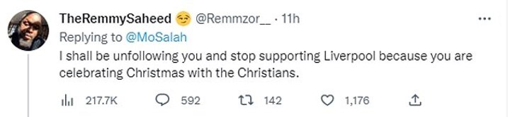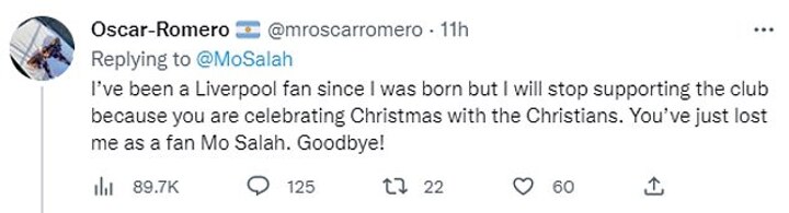 Another said: 'I’ve been a Liverpool fan since I was born but I will stop supporting the club because you are celebrating Christmas with the Christians. You’ve just lost me as a fan Mo Salah. Goodbye!'