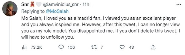 'Mo Salah, I loved you as a madrid fan. I viewed you as an excellent player and you always inspired me. However, after this tweet, I can no longer view you as my role model. You disappointed me. If you don‘t delete this tweet, I will have to unfollow you,' a third said.