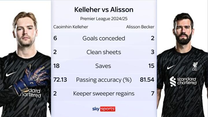 The more experienced Alisson tops Kelleher for save percentage and in goals-prevented data this term, though, so will Slot throw the Brazilian back into the mix on Sunday?