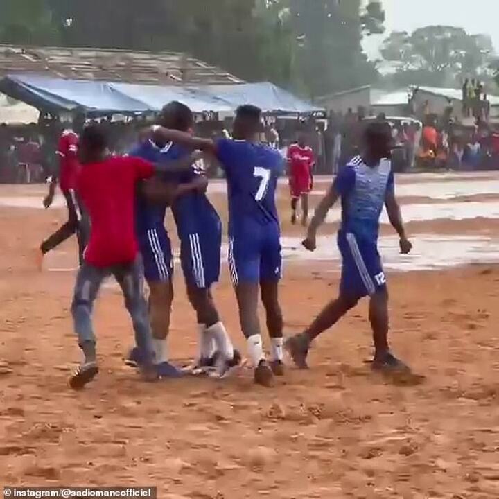 In a video posted on his Instagram, Mane can be seen playing on a muddy pitch alongside the aforementioned players and friends from his village.