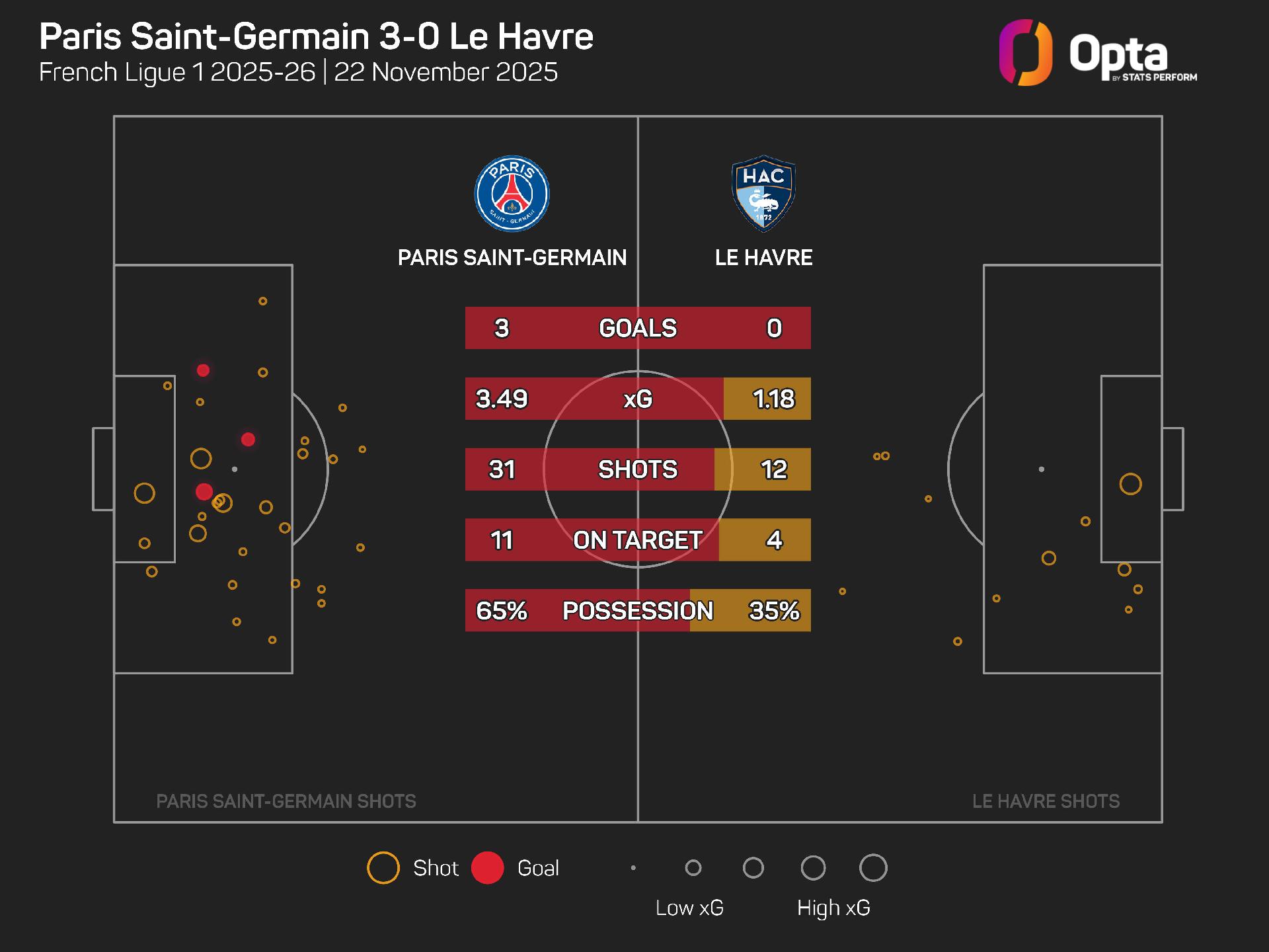 Le Havre did cause PSG problems, though, firing 12 shots of their own, but only four forced Lucas Chevalier into action, with Luis Enrique hoping his team can rediscover their flow against Tottenham in the Champions League on Wednesday.