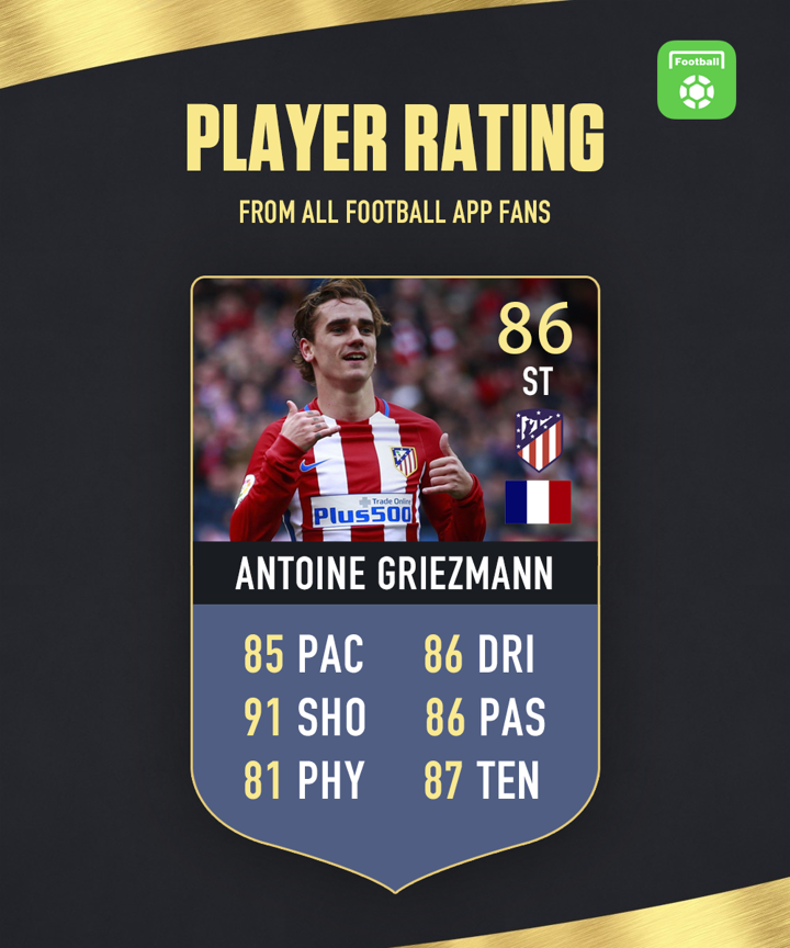 Hello everyone, welcome to - Daily Player Rating! You could be the judge and rate one player every day at 10:00 CET. The results will be declared in the form of Fut Card tomorrow. We released the rating of Antoine Griezmann yesterday. He got 86 total points with highest 91 in shooting. The detailed results are as follows: