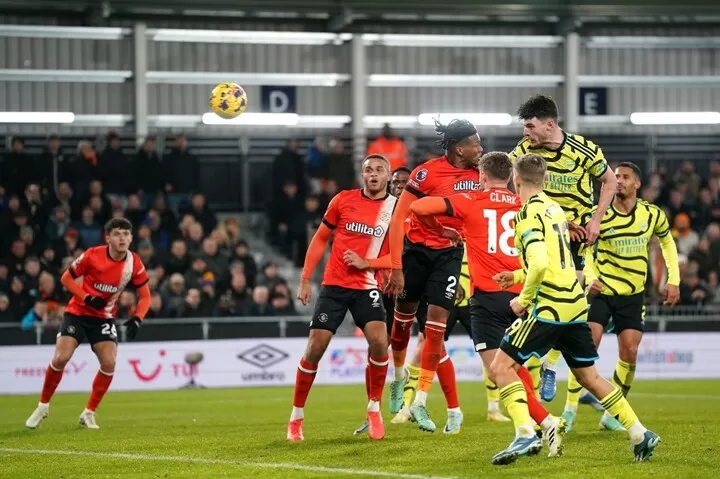 Declan Rice's last-gasp header snatched victory for Arsenal in a seven-goal thriller at Luton to move them five points clear at the top of the Premier League.