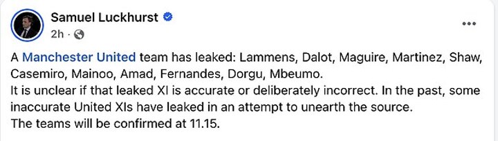 But the mole appears to have come again after Samuel Luckhurst, United correspondent at The Sun newspaper, shared the lineup before Saturday's Manchester Derby.