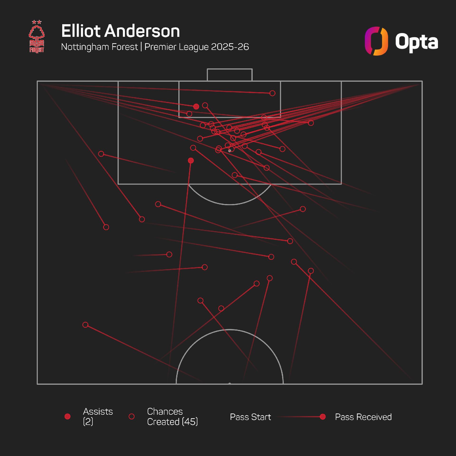 Elliot Anderson has made more successful passes than any other midfielder in the Premier League this season (1,679).
