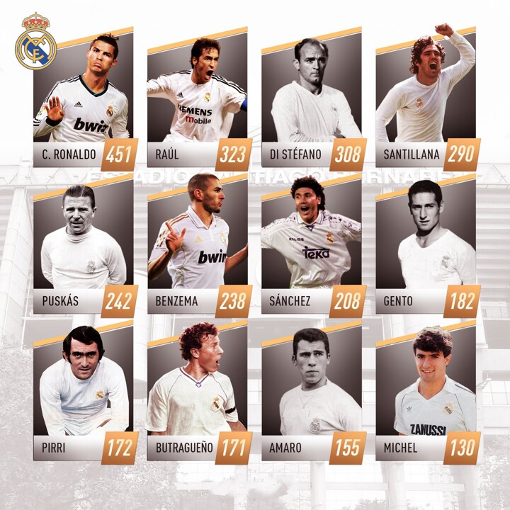 Juventus ace Ronaldo is still the all-time top scorer in Real Madrid's history with 451 goals in just 438 appearances.