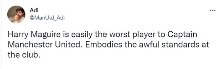 One other equally furious supporter added: 'Harry Maguire is easily the worst player to captain Manchester United. Embodies the awful standards at the club.'