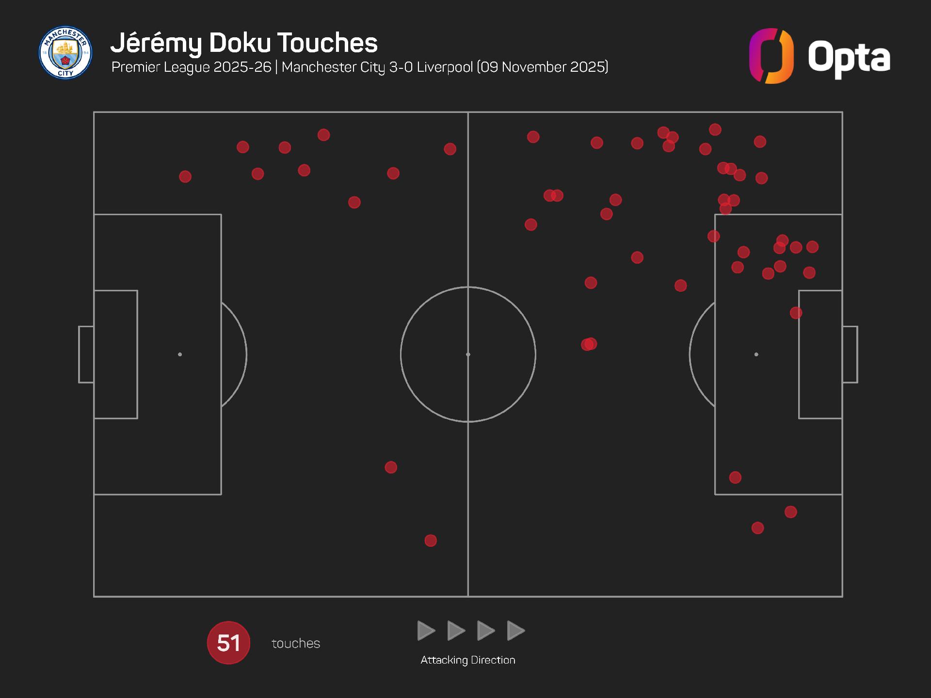 Doku, though, was the star of the show, getting all three of his shots on target, while leading the way for touches in the opposition box (11) and completing seven of his 10 dribble attempts.