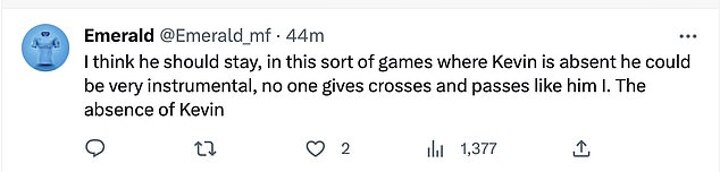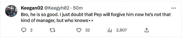 Tweeting: 'Bro, he is so good. I just doubt Pep will forgive him now. He's not that kind of manager, but who know's.'