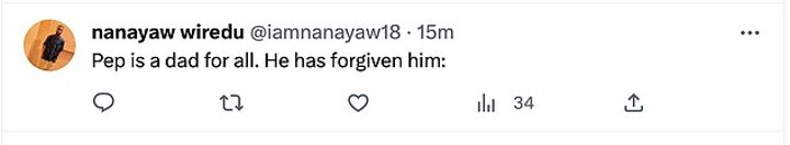 But another fan had an opposing view on Guardiola's tolerance for forgivness, believing that all is now well with him and the defender.