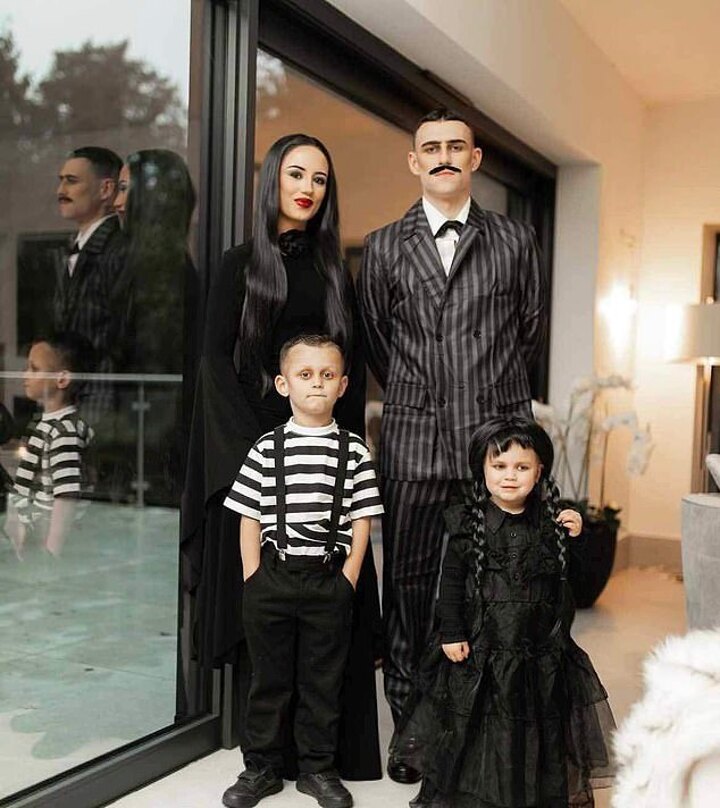 Foden wore a pin-striped Gomez suit and pencilled moustache while partner Rebecca Cooke went full Morticia. Their children completed the look as Wednesday and Pugsley in matching black-and-white outfits.