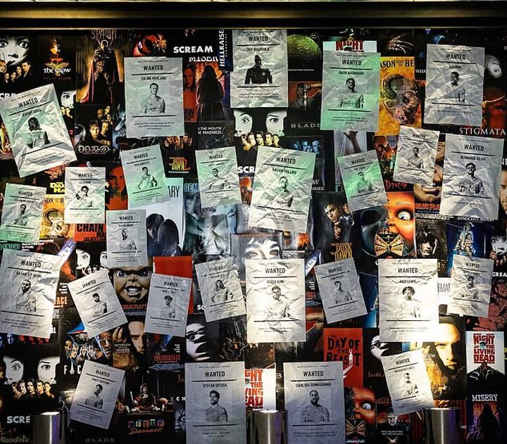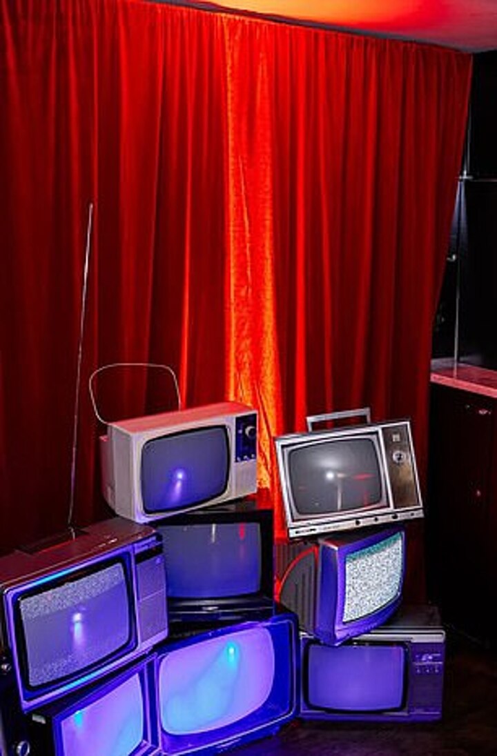 Inside, stacks of vintage televisions flickered beneath scarlet lighting and walls were plastered with 'Wanted' posters for Pep Guardiola, Erling Haaland and several team-mates.