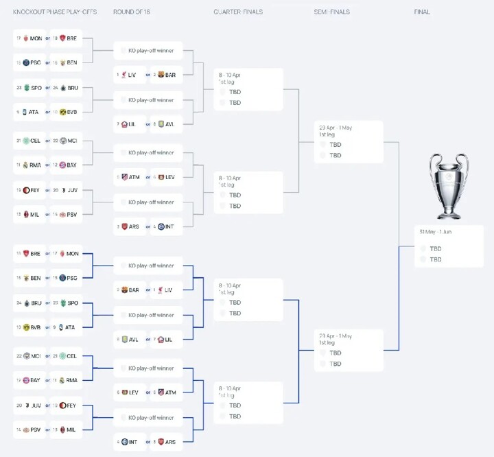 ManCity will play REAL MADRID OR BAYERN MUNICH in the Champions League play-offs, and should they progress will play ATLETICO MADRID OR BAYER LEVERKUSEN in the round of 16; draw takes place this Friday.