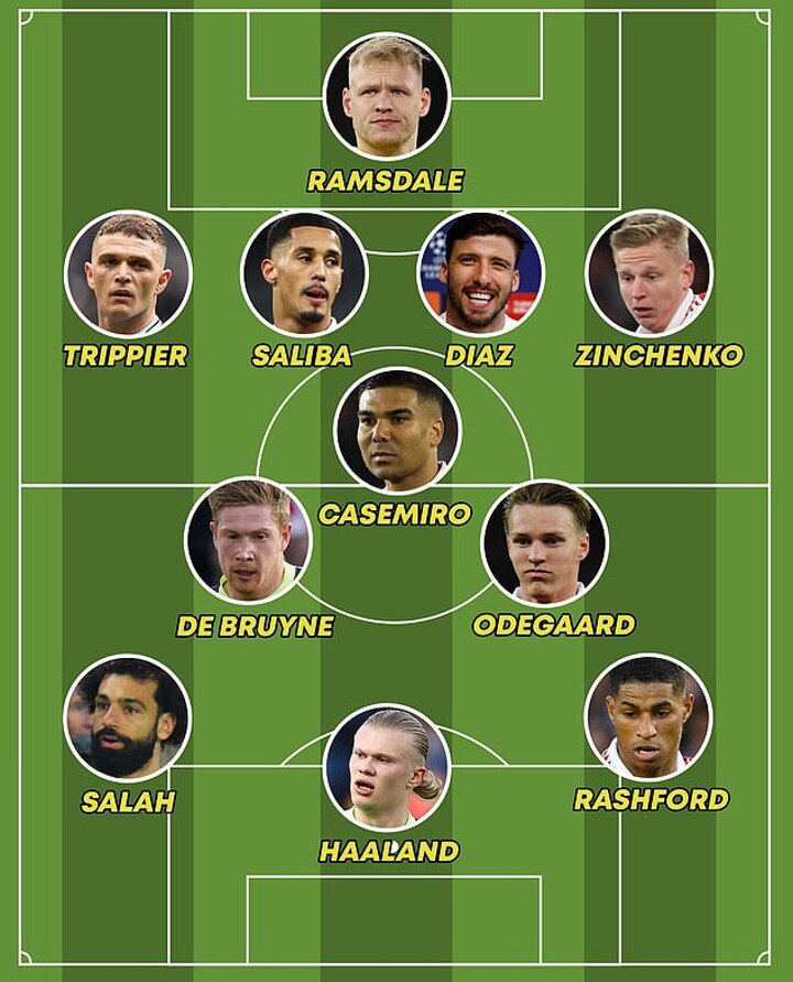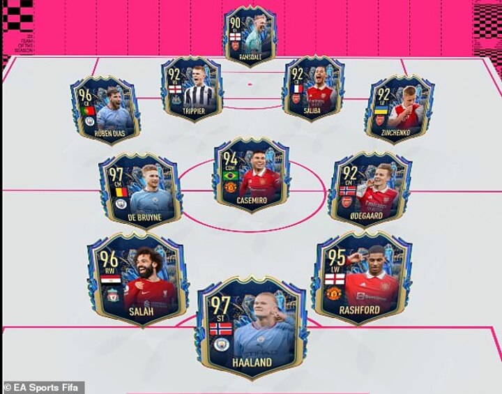 EA Sports' FIFA 23 Premier League Team of the Season (4-3-3): Aaron Ramsdale (Arsenal); Kieran Trippier (Newcastle), William Saliba (Arsenal), Ruben Dias (Manchester City), Oleksandr Zinchenko (Arsenal); Kevin De Bruyne (Manchester City), Casemiro (Manchester United), Martin Odegaard (Arsenal); Mohamed Salah (Liverpool), Erling Haaland (Manchester City), Marcus Rashford (Manchester United).