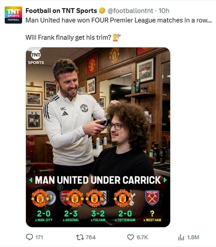 TNT Sports shared a post on X after Saturday's game, teasing Frank about his potential barbers' appointment on Wednesday, saying: 'Man United have won FOUR Premier League matches in a row... Will Frank finally get his trim?'