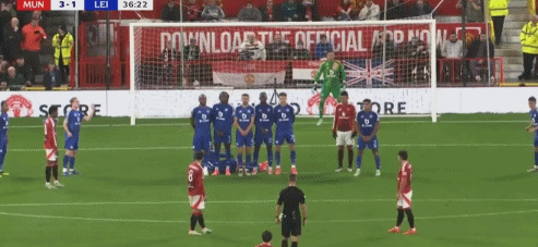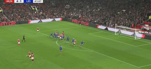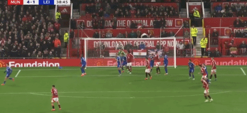 36' GOAL! Bruno's free kick takes a deflection and goes in! Man Utd 3-1 Leicester