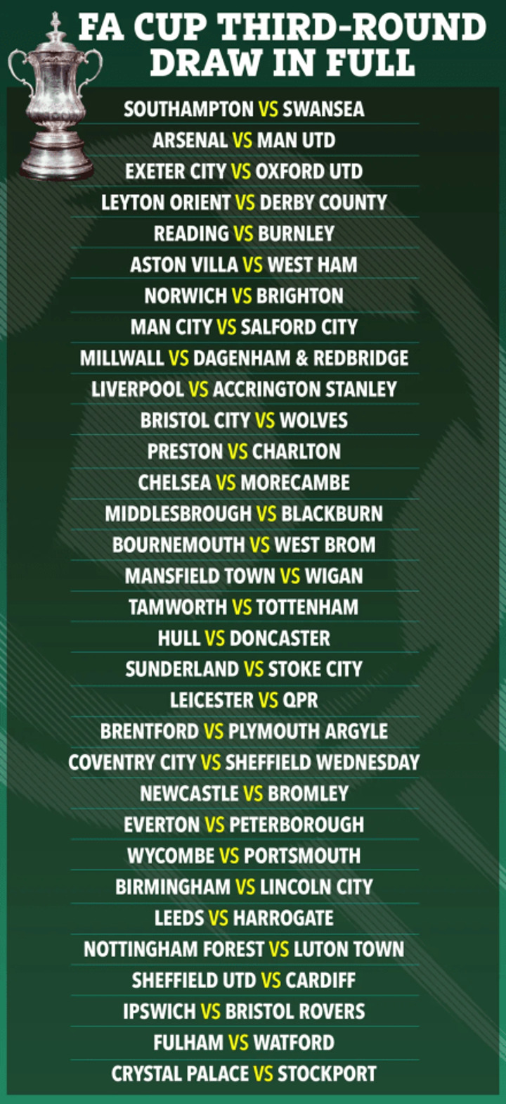 As well as Arsenal vs Man Utd, a number of other third-round ties caught the eye including Manchester City vs Salford, Tamworth vs Tottenham and Everton vs Peterborough - which could see Ashley Young face son Tyler.