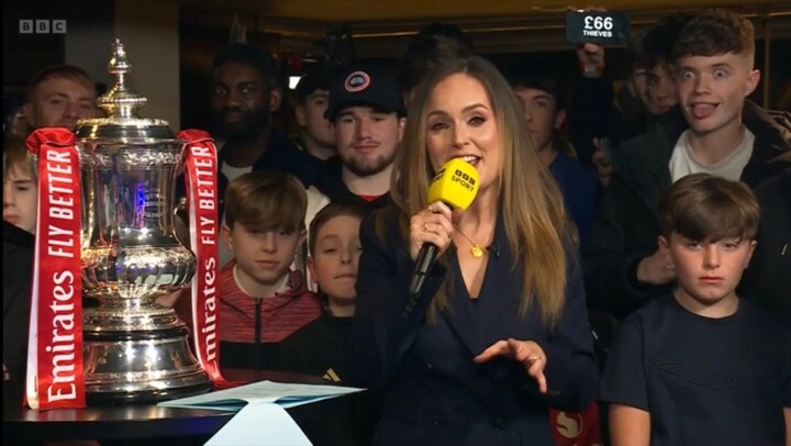 BBC host Kelly Somers was surrounded by Man Utd fans as she presented coverage of the FA Cup draw - with the trophy situated next to her.