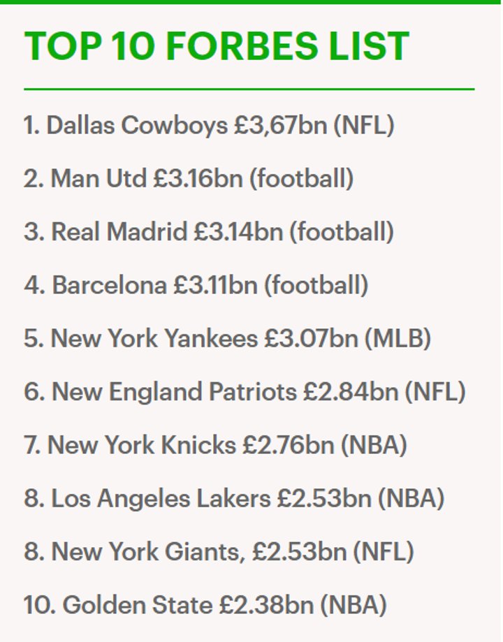US sports dominated the list, with eight NBA teams also included, and six MLB franchises.