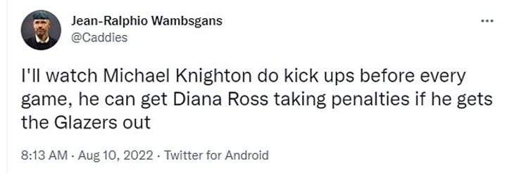 They wrote: 'I'll watch Michael Knighton do kick ups before every game, he can get Diana Ross taking penalties if he gets the Glazers out.'