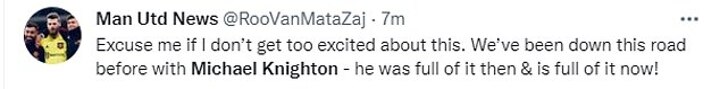 A Man United news account wrote: 'Excuse me if I don't get too excited about this. We've been down this road before with Michael Knighton - he was full of it then and is full of it now.'