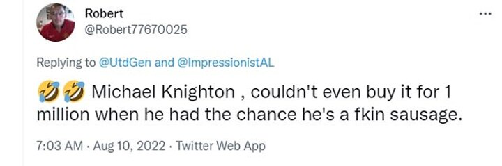 While Twitter user Robert commented: 'Michael Knighton couldn't even buy it for 1 million when he had the chance he's a fkin sausage.'