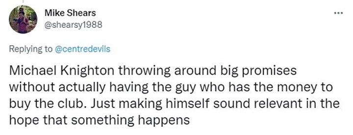 Mike Shears added: 'Michael Knighton throwing around big promises without actually having the guy who has the money to buy the club.