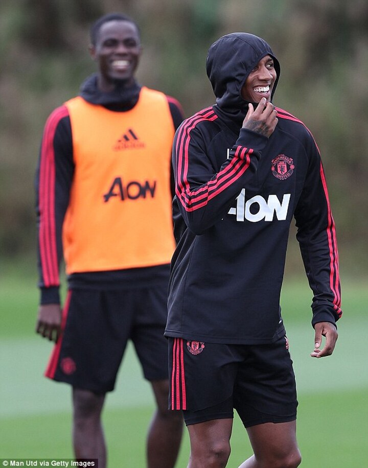 Players looked to be divided into two teams as they then went on to compete agains each other. They could be seen running in and out of cones while Anthony Martial was spotted trying to grapple Nemanja Matic.