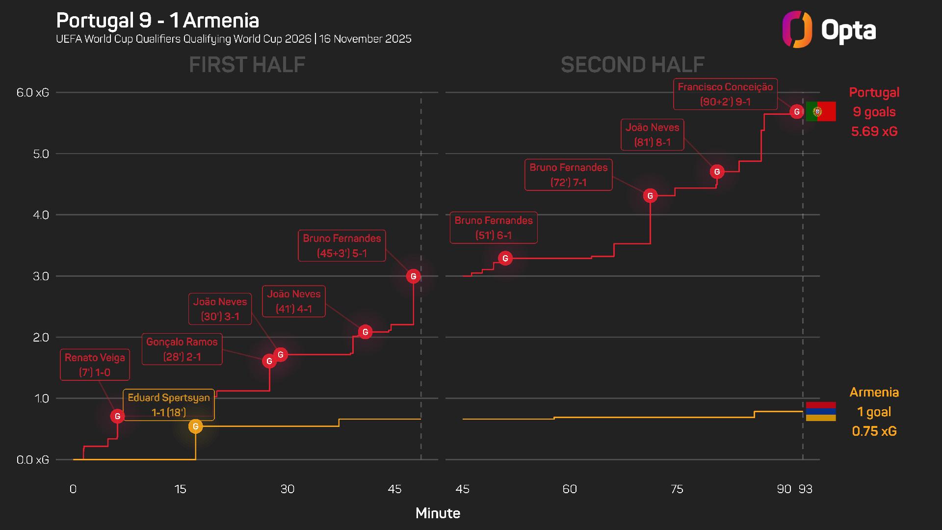 Questions had been raised about where the goals would come from in Ronaldo's absence, but Bruno Fernandes and Joao Neves both netted hat-tricks, with Renato Veiga, Goncalo Ramos and Francisco Conceicao also on the scoresheet.