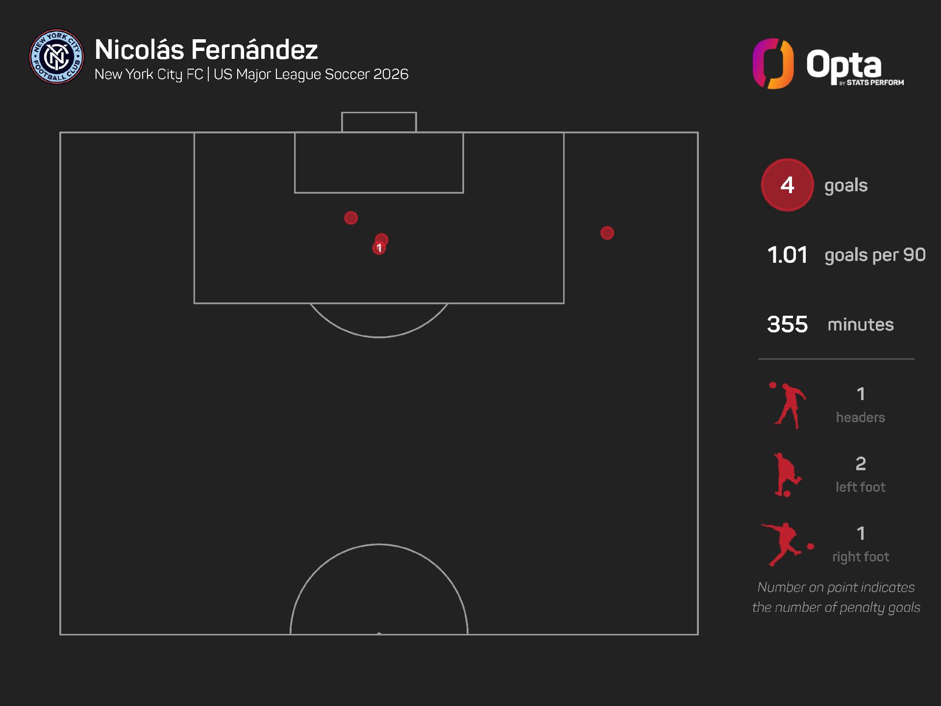 Nicolas Fernandez scored two of NYCFC's three goals in their win on Saturday, taking his total to nine goals in 20 MLS appearances (regular season & playoffs) for the club.