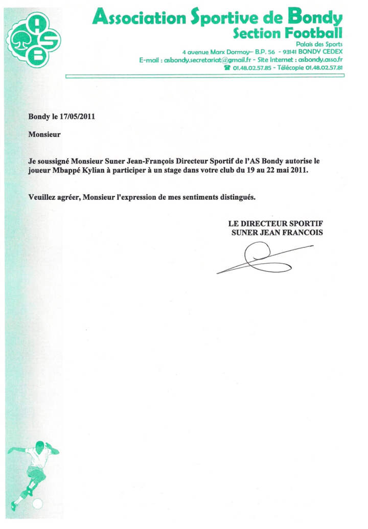The letter is typed on AS Bondy headed paper, dated 17 May 2011. It gives permission for a 12-year-old French boy named Kylian Mbappe to attend a four-day trial the following week.