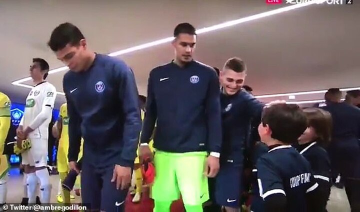 The young fan soon steadies himself for the occasion before taking Silva's hand and wearing a wide grin as they emerge from the tunnel at the Parc des Princes.